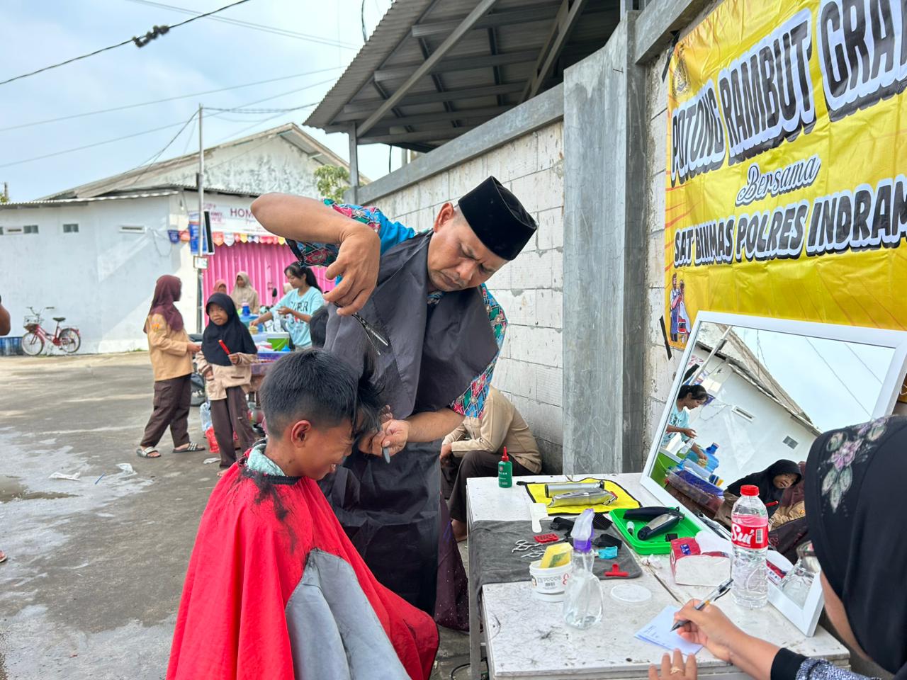 Indramayu – Dalam rangka program Jum’at Berkah, Polres Indramayu Polda Jabar melalui Sat Binmas menggelar kegiatan potong rambut gratis bagi para pelajar yang kurang mampu di Komplek Perumahan Nelayan, Desa Karangsong, Kecamatan/Kabupaten Indramayu, Jumat (28/11/2025).