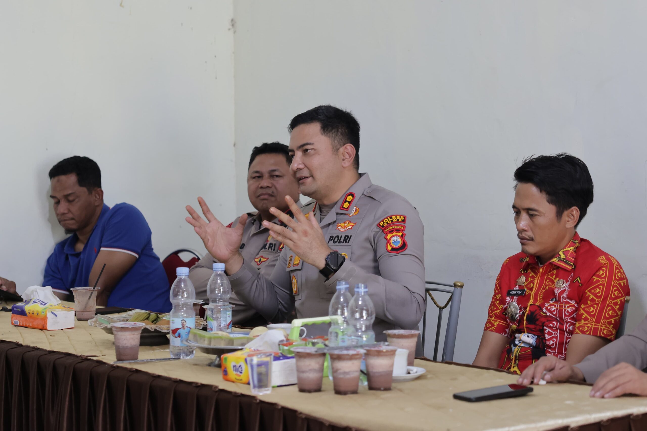 Untuk meredam potensi gesekan lanjutan, Kapolres memimpin pertemuan besar dengan seluruh kepala desa, kepala dusun, lurah, tokoh adat, tokoh agama, serta ormas.