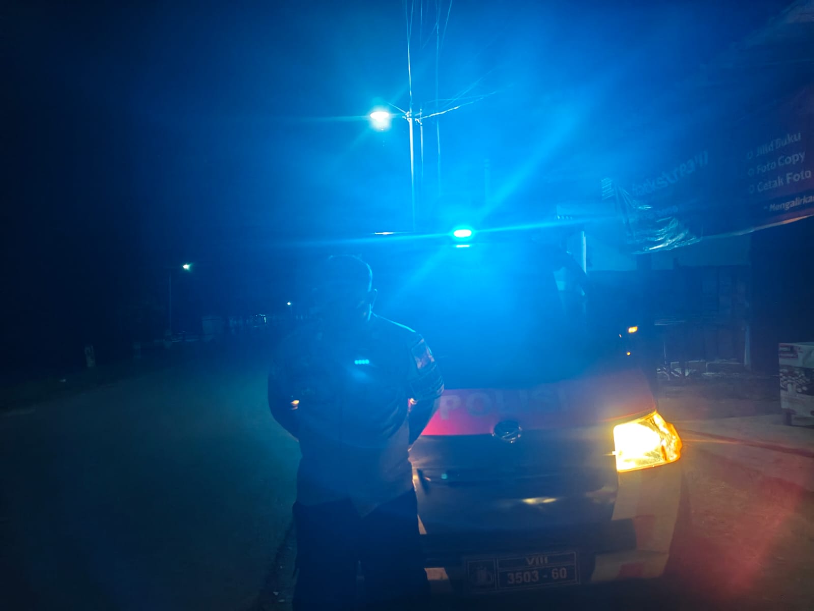 Dengan menyalakan rotator dan menggunakan senter penerangan, personel memastikan tidak ada aktivitas mencurigakan maupun kerumunan remaja yang berpotensi menimbulkan keributan.
