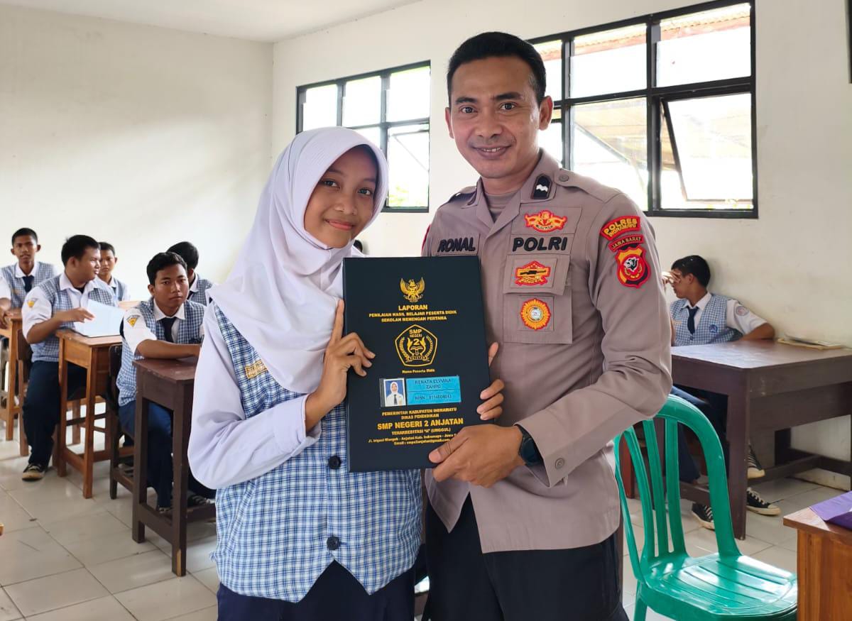 Personel Polsek Indramayu Polres Indramayu Polda Jabar turun langsung mendampingi pengambilan rapor bagi anak yatim di SMPN 2 Anjatan, Selasa (23/12/2025).