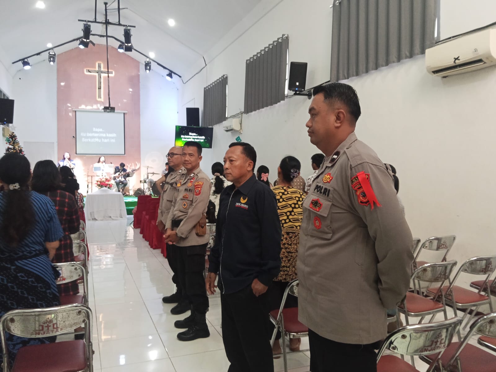 INDRAMAYU — Personil Polsek Anjatan jajaran Polres Indramayu Polda jabar bersama TNI melakuan pengamanan kegiatan kebaktian awal Tahun 2026 di Gereja wilayah Kecamatan Anjatan, Kabupaten Indramayu, Jawa Barat, Senin (1/1/2026).