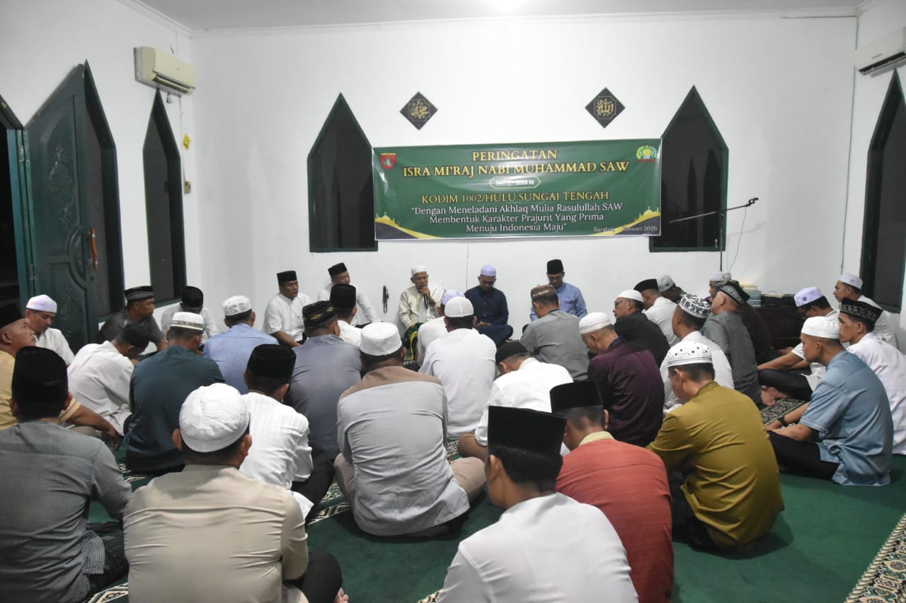 Peringatan Isra Mi’raj tahun ini mengusung tema “Dengan Meneladani Akhlak Mulia Rasulullah SAW Membentuk Karakter Prajurit yang Prima Guna Menuju Indonesia Maju.” Kegiatan diikuti oleh prajurit TNI, PNS Kodim 1002/HST beserta keluarga dengan penuh khidmat dan kebersamaan.