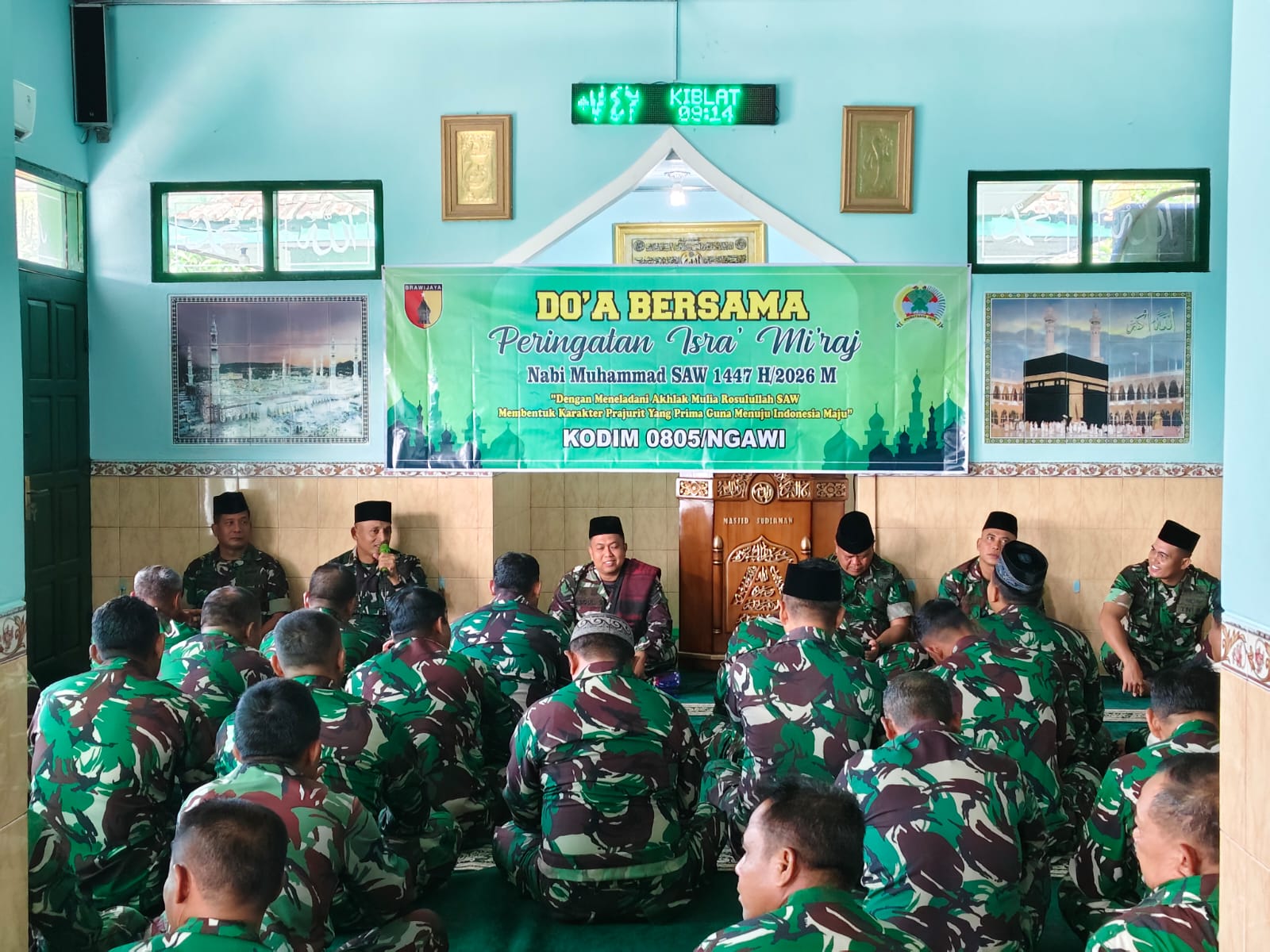 NGAWI, BUSERJATIM.COM GROUP– Anggota Kodim 0805/Ngawi bersama Pegawai Negeri Sipil (PNS) Kodim 0805/Ngawi menggelar peringatan Isra Mi’raj Nabi Muhammad SAW 1447 Hijriah/2026 M, bertempat di Masjid Sudirman, Makodim 0805/Ngawi, Senin (19/1/2026).