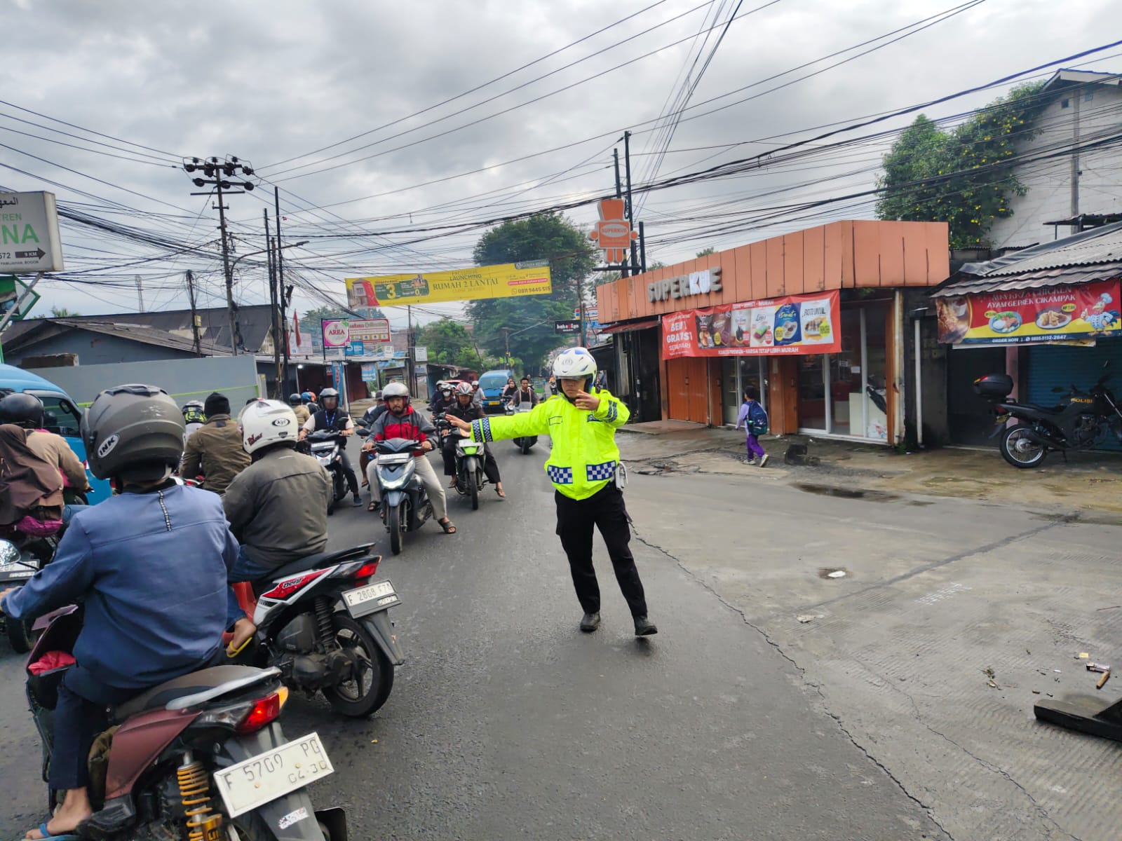Anggota Lantas Polsek Ciampea Polres Bogor membantu masyarakat melakukan pengaturan lalu lintas di titik titik rawan kemacetan serta petugas juga melakukan pengaturan terhadap anak-anak yang menyebrang menuju sekolah.