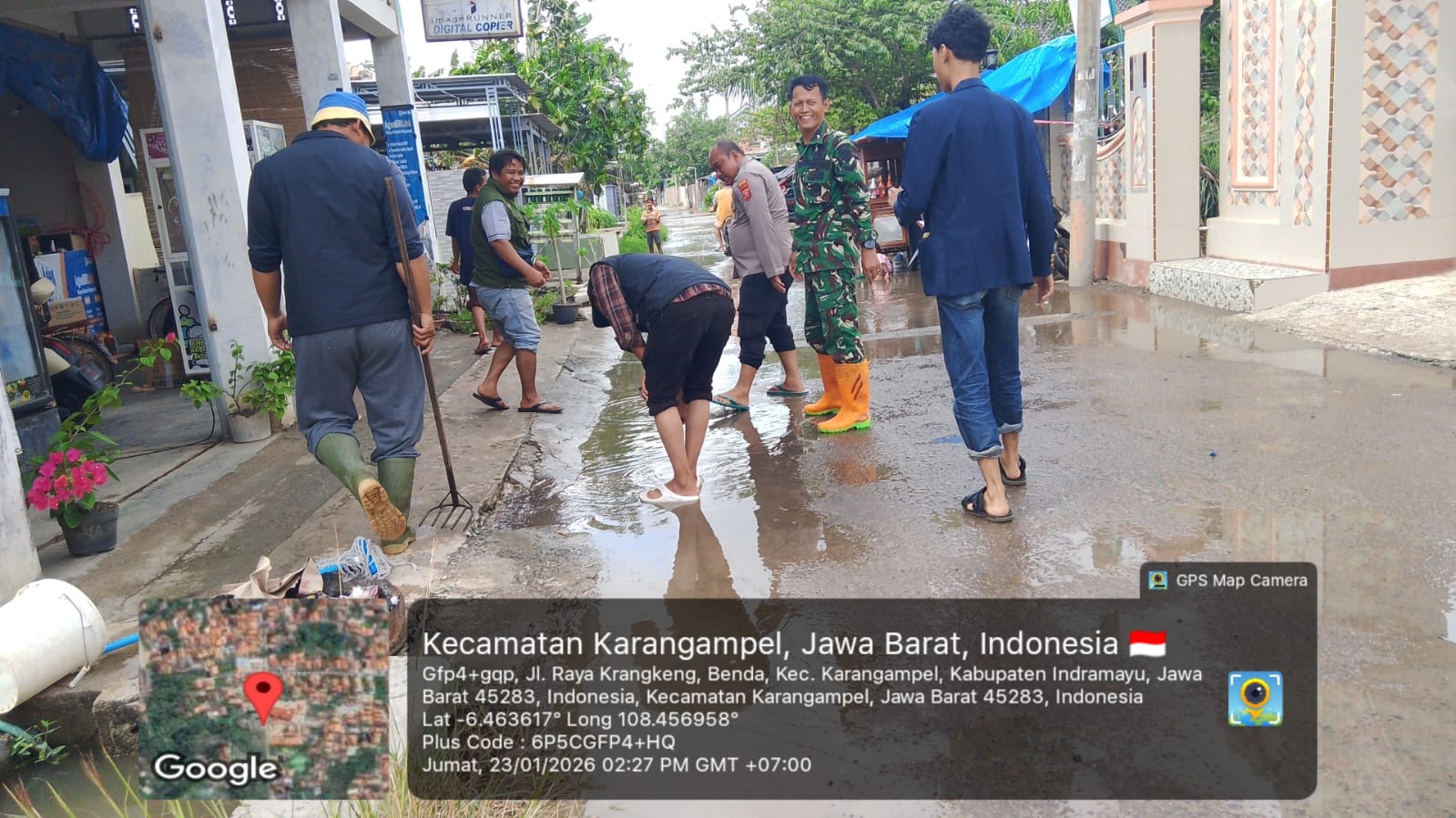 Indramayu – Personel Polsek Karangampel Polres Indramayu Polda Jawa Barat bersama pemerintah desa dan TNI melaksanakan monitoring debit air saluran yang meluap ke pemukiman warga dan jalan raya akibat curah hujan yang berkepanjangan di wilayah Desa Benda, Kecamatan Karangampel, Kabupaten Indramayu, Jumat (23/1/2026) kemarin.