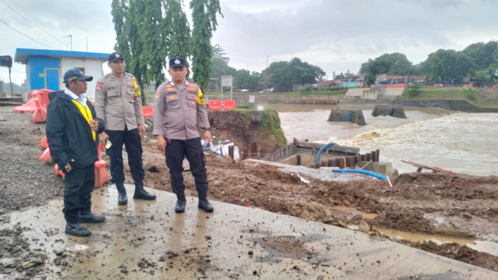 Indramayu – Personel Polsek Lohbener Polres Indramayu Polda Jawa Barat monitoring perkembangan debit air Sungai Cimanuk di Bendung Karet Rambatan, Desa Rambatan Kulon, Kecamatan Lohbener, Kabupaten Indramayu, Senin (26/1/2026).