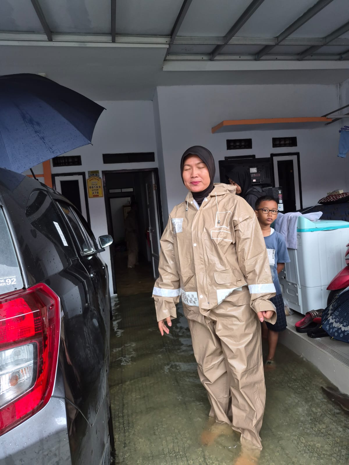 Di dalam rumah, terdapat anggota keluarganya yang sedang sakit dan tidak mampu berjalan, sementara akses keluar rumah terputus akibat banjir.