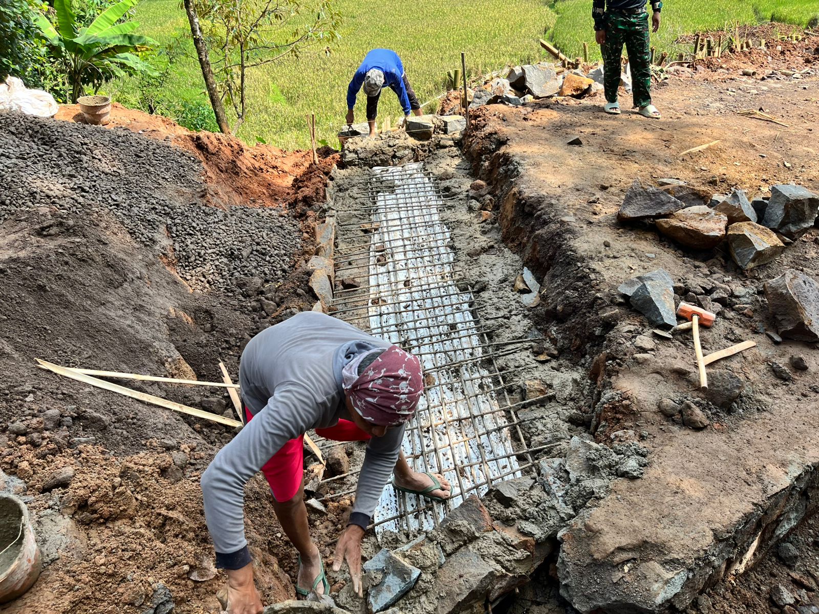 Semangat kebersamaan antara TNI dan masyarakat terlihat jelas di lokasi pekerjaan. Dengan gotong royong, mereka bahu-membahu menyelesaikan pengecoran gorong-gorong sebagai bagian dari pembangunan infrastruktur desa yang menjadi sasaran program TMMD.