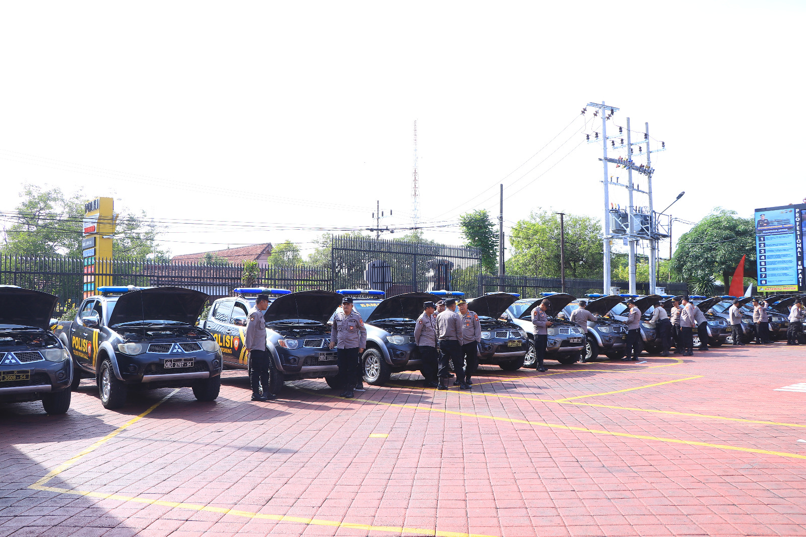 Pemeriksaan meliputi kondisi mesin, kelengkapan kendaraan, lampu rotator, sirene, hingga kebersihan kendaraan guna memastikan seluruh ranmor dalam kondisi siap pakai.