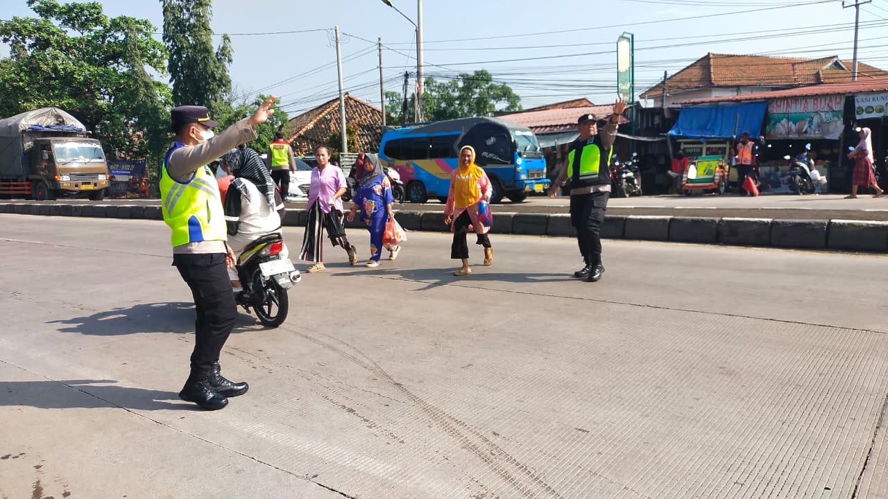 INDRAMAYU – Di tengah padatnya arus lalu lintas jalur Pantura, personel Satgas Ops Ketupat Lodaya 2026 Polres Indramayu Polda Jabar tetap mengedepankan sisi kemanusiaan. Selain fokus pada pengaturan kendaraan, petugas yang bersiaga di Pos Pam Pasar Parean, Kecamatan Kandanghaur, tampak sigap membantu warga setempat menyeberangi jalan raya yang ramai, Minggu (15/03/2026).