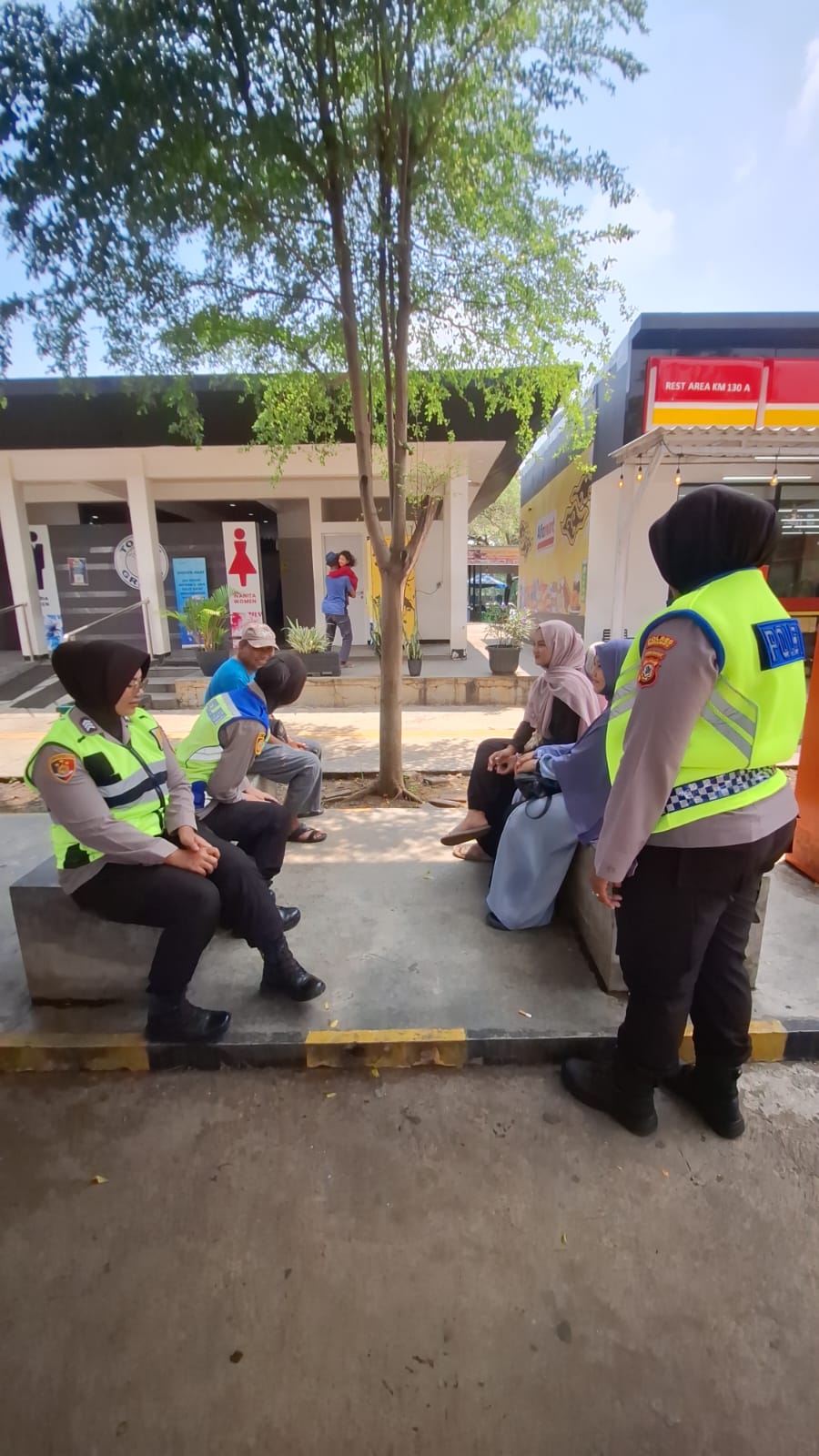 Selasa pagi (17/3/2026), sejumlah personel Polwan Polres Indramayu menyambangi para pemudik yang sedang beristirahat di Rest Area KM 130A, Kabupaten Indramayu.