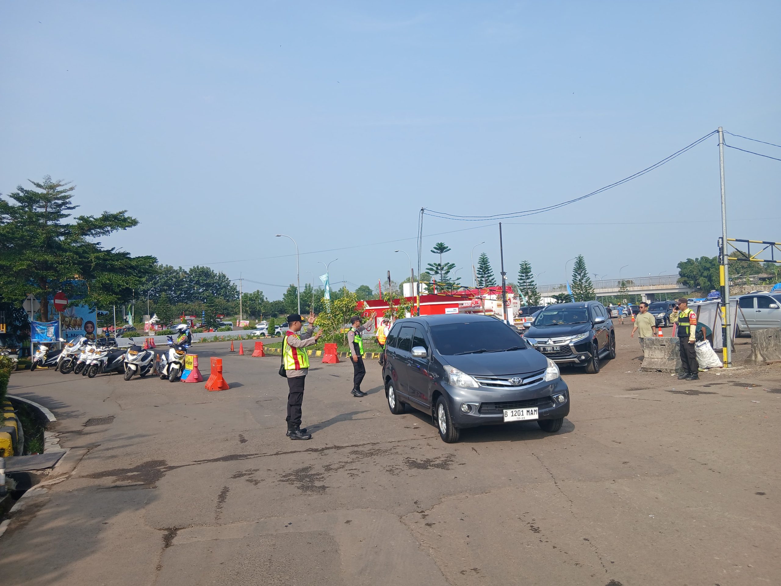 Personel Regu I Pos Pelayanan (Pos Yan) Rest Area KM 130A Tol Cipali melaksanakan pengaturan kendaraan serta memberikan imbauan kamtibmas langsung kepada para pemudik, Rabu (18/03/2026).