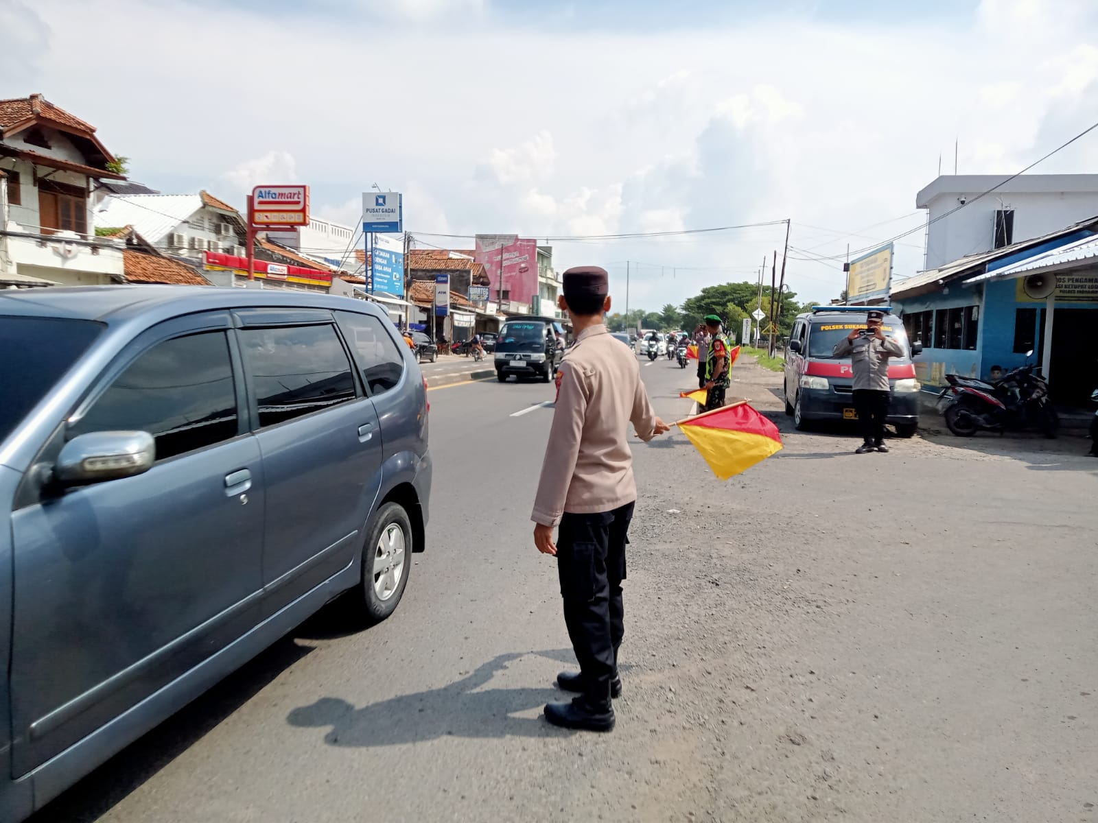 Pengaturan arus lalu lintas dilakukan, tepatnya di depan Pos Pam Pasar Tulungagung, Kecamatan Kertasemaya, Kabupaten Indramayu. Senin (23/3/2026)
