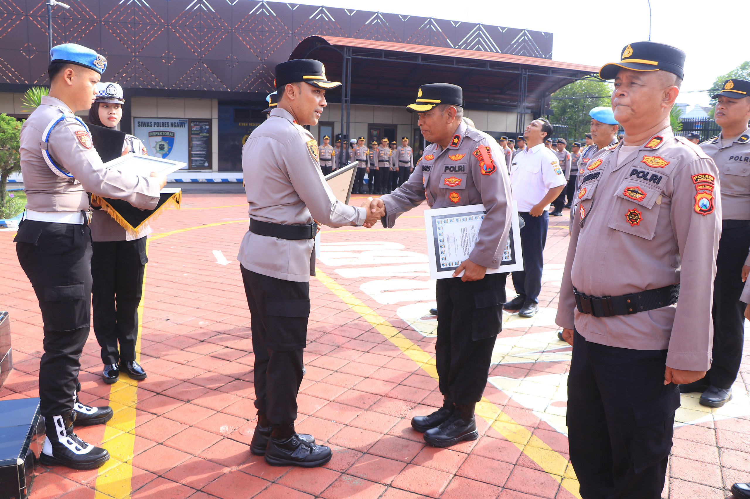 Ngawi – Kapolres Ngawi Prayoga Angga Widyatama, S.I.K., M.Si., memimpin langsung upacara pemberian penghargaan kepada personel berprestasi di lingkungan Polres Ngawi. Kegiatan tersebut dilaksanakan di Lapangan Satya Haprabu Polres Ngawi.