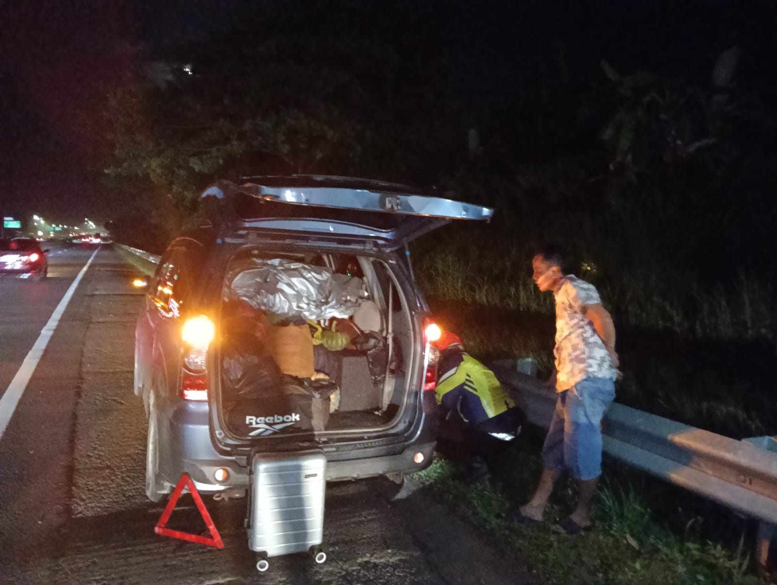Sabtu dini hari (28/3/2026), melalui pusat layanan Kepolisian 110, petugas menerima laporan dari seorang pengendara bernama Faisal Ali yang mengalami kendala teknis berupa ban bocor saat melintasi jalur Tol Cipali KM 138.