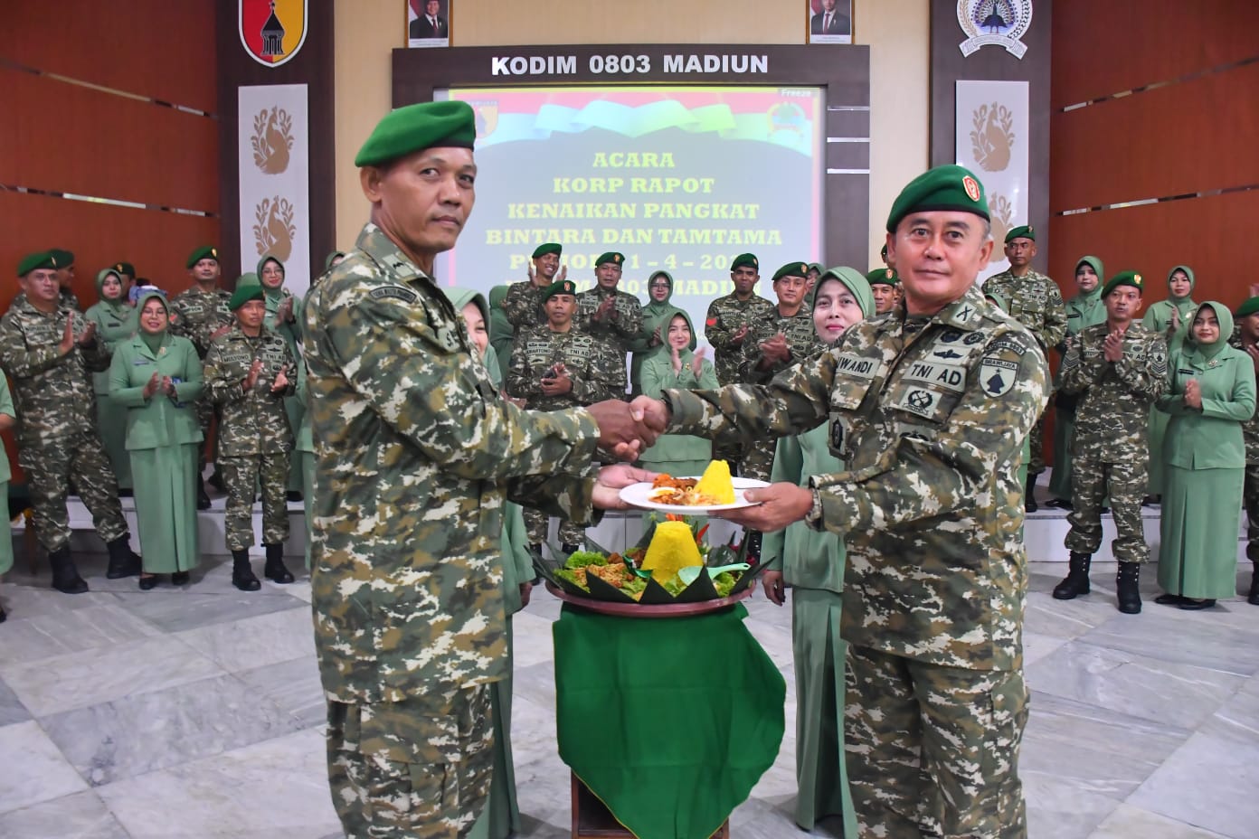 Kegiatan yang berlangsung di Aula Makodim 0803/Madiun ini turut dihadiri para Danramil, perwira staf, anggota, Aparatur Sipil Negara (ASN), serta Persit Kartika Chandra Kirana. Prosesi berjalan tertib dan penuh makna, ditandai dengan penyematan pangkat baru secara simbolis kepada perwakilan prajurit.
