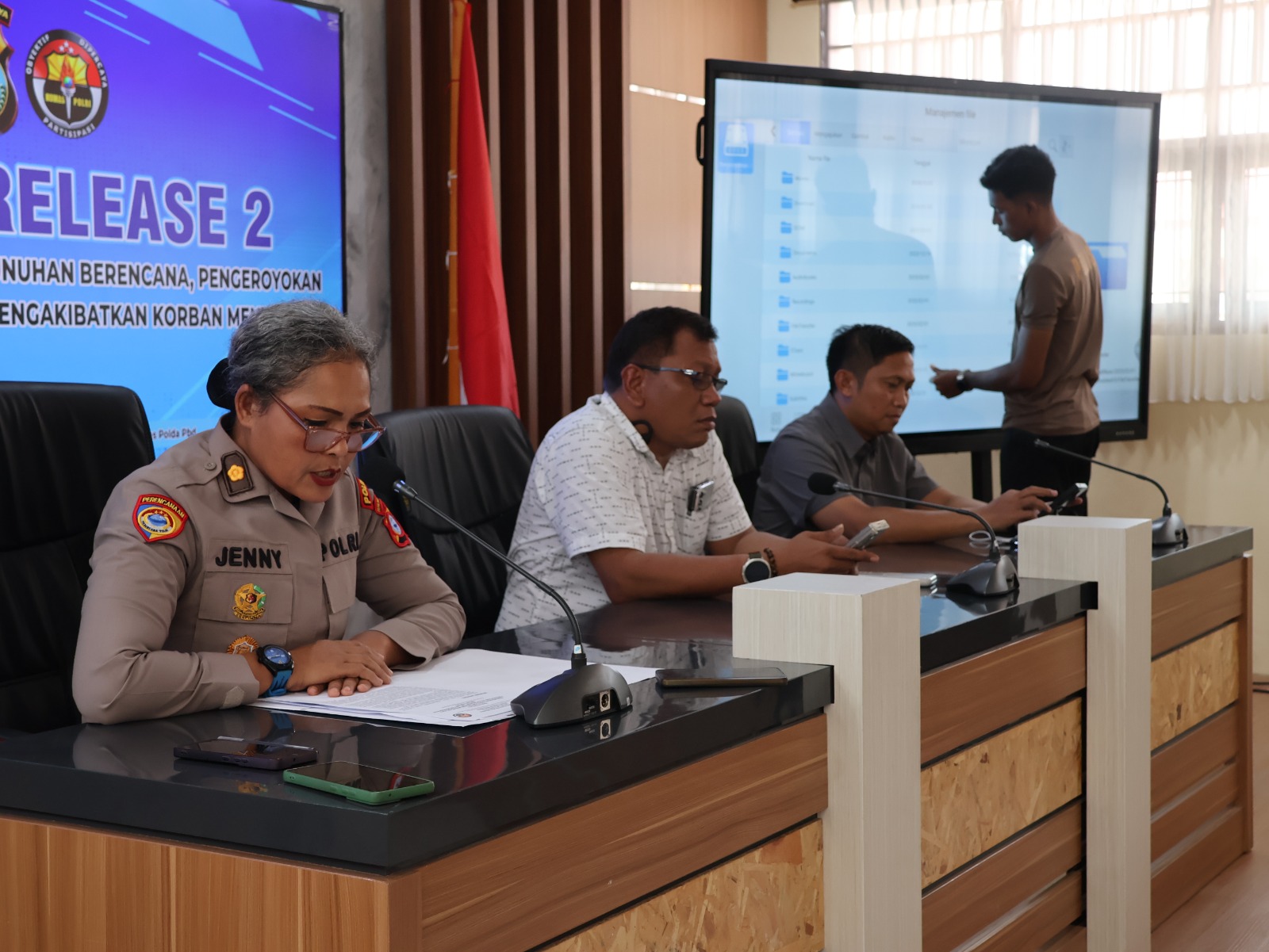 Konferensi pers tersebut dipimpin langsung oleh Junov Siregar selaku Direktur Reserse Kriminal Umum, didampingi Ardy Yusuf yang menjabat sebagai Kasubdit Jatanras, serta perwakilan Bidang Humas yang mewakili Kapolda Papua Barat Daya Gatot Haribowo. Kegiatan berlangsung di ruang rapat Markas Komando Polda Papua Barat Daya, Sorong.