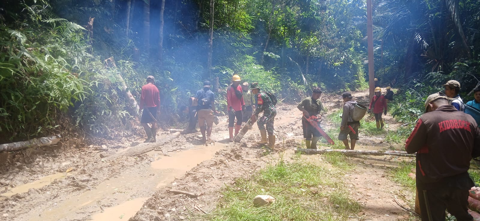 BARABAI, BUSERJATIM.COM GROUP – Babinsa Koramil 1002-01/Batang Alai Selatan, Serda Erli Sepriyanto bersama warga masyarakat Desa Atiran melaksanakan kegiatan gotong royong pembersihan jalan sepanjang kurang lebih 2,5 kilometer dalam rangka penyiapan instalasi program listrik desa, Selasa (7/4).